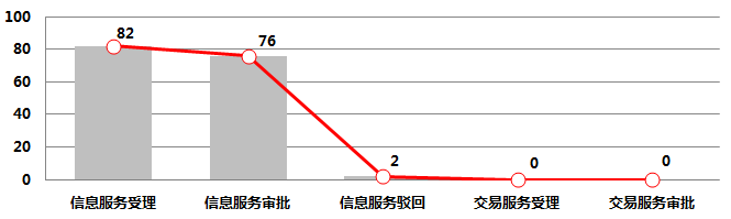 三、互联网药品服务机构审批情况2018年上半年,互联网药品信息服务受理82件,信息服务审批76件,信息服务驳回2件,交易服务受理0件,交易服务审批0件。详见附表8。 图4-3-12018年上半年全省互联网药品服务审批情况表
